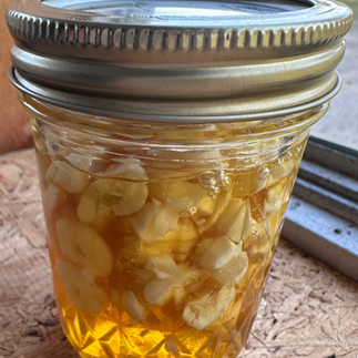 6. Strain honey from garlic. The garlic can be used for a new batch or in a vinaigrette.